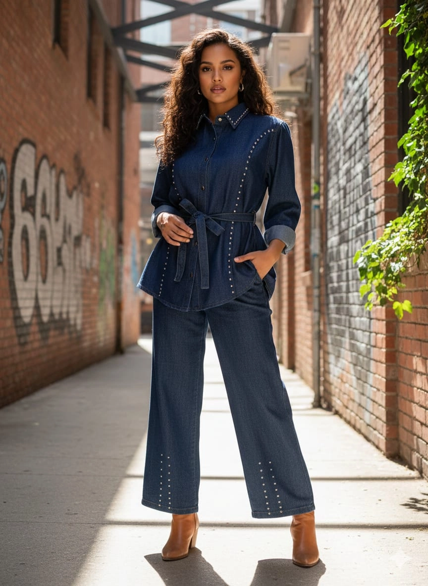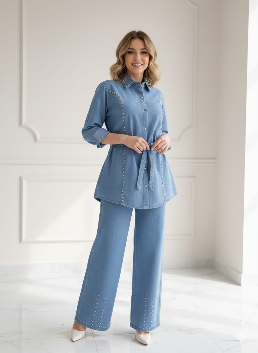 Awin Beautiful denim cordset with locked stone detailing and belt - TBEVA designs